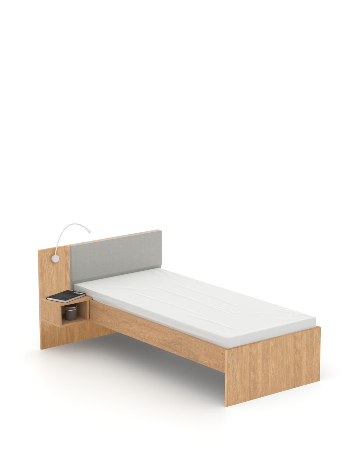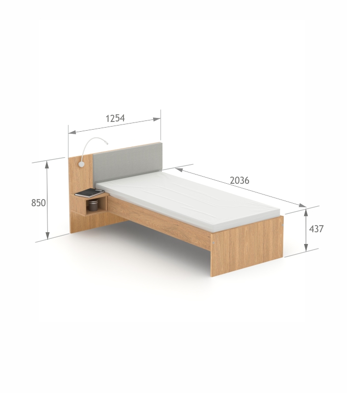 Легло с нощно шкафче с вградена лампа и USB изход. Тапицираната табла е налична в 8 цветове: бял, сив, антрацит, атлантик, син, жълт, розов, черен.